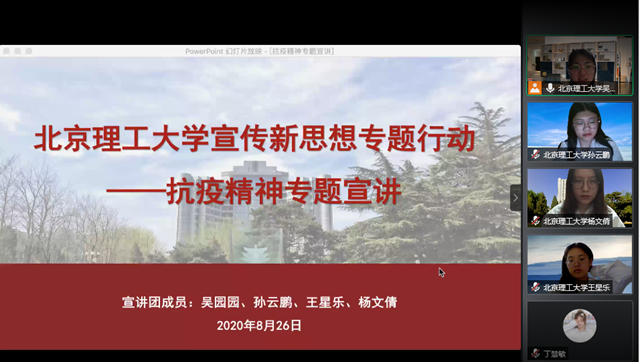 实践团成员以饱满的热情投入宣讲实践中,积极理性的发声得到同学们的一致好评。通过此次宣讲实践活动,实践团成员表示,作为beat365亚洲版官网学生将继续加强理论学习、提高专业素养,发挥专业优势,讲好抗疫故事,展示出北理工学子积极向上的精神风貌,展出出青年马克思主义者的时代担当。
