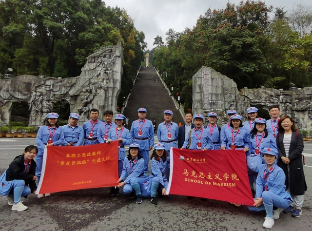 “本次‘重走长征路’遵义行,走入实地、身处实景、触摸实物,沉浸体验观旧址、听讲述、忆先烈,精神洗礼、灵魂淬炼,感怀革命事业艰辛不易,为我们讲好思政课提供了鲜活素材,也接受了一次深刻教育。”参加完“重走长征路”活动的老师们这样说。2020年11月5日-11月8日,beat365亚洲版官网22名思政教师开展了“重走长征路”的第二站活动,本站为中央红军长征走向伟大胜利的转折地--贵州遵义。本次活动以“重走长征路”为主线,缅怀革命先烈,观红色旧址,唱红色歌曲,感受红色精神,传承红色文化为主要内容,让教师们真正的亲身体会长征精神。“重走长征路”活动是北理工beat365亚洲版官网针对思政教师社会实践不足问题进行设计的系列活动。按照长征路线,系统设计了突围、转折、出奇、团结、挑战卓绝、曙光、会师之旅八个模块,分期分批组织教师开展现场体验,编写教学案例,为思政课教师在课堂“把理说透”,大力提升思政课抬头率、点头率奠定扎实的理论和实践基础,同时也希望思政教师通过此活动,能拧成一股绳,以长征精神相互勉励,为学校的发展以及“双一流”建设贡献自己的力量。