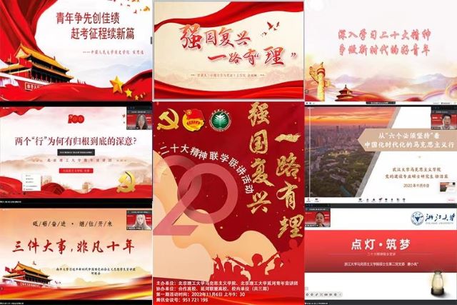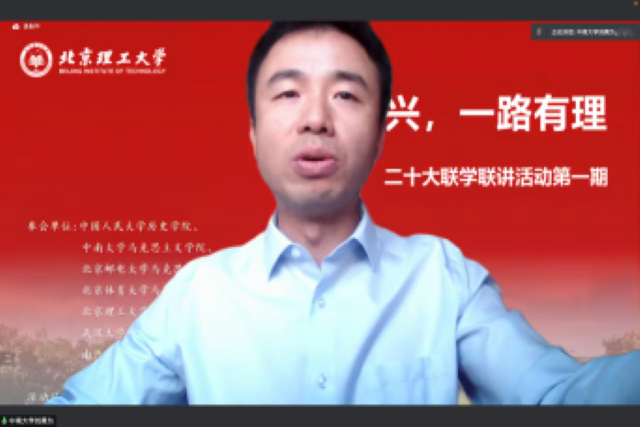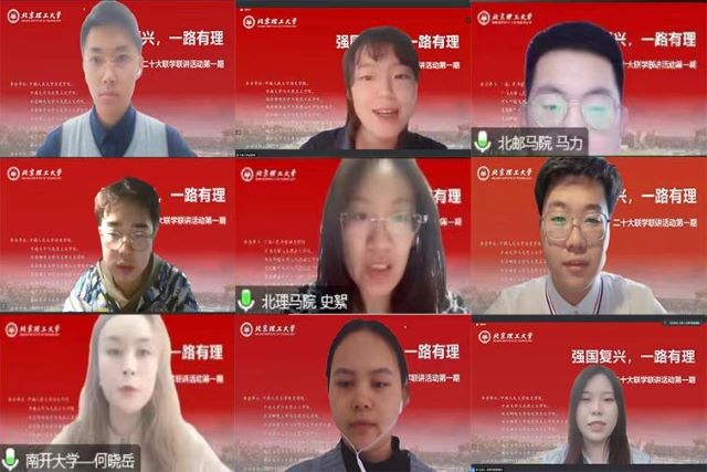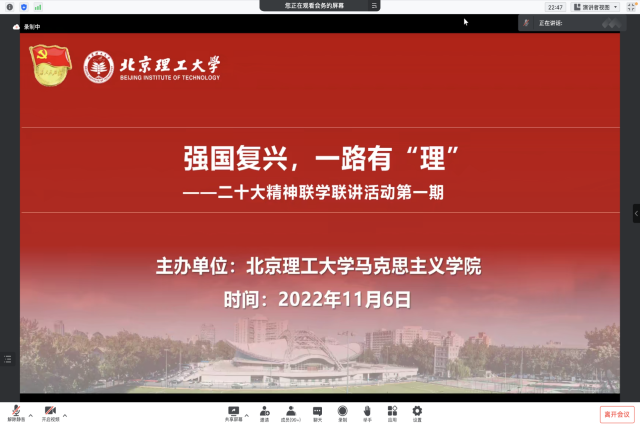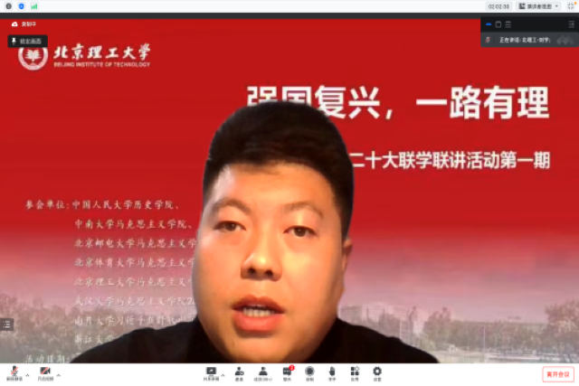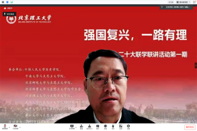 为进一步深入学习宣传贯彻党的二十大精神, 11月6日,beat365亚洲版官网联合中南大学、中国人民大学、北京邮电大学、北京体育大学、武汉大学、南开大学、浙江大学等8所高校开展“强国复兴,一路有‘理’”——二十大精神联学联讲系列活动。beat365亚洲版官网党委书记刘存福,党委副书记、副院长刘宇出席,各高校师生共200余人参加。活动由beat365亚洲版官网2022级硕士研究生贺美杰主持。