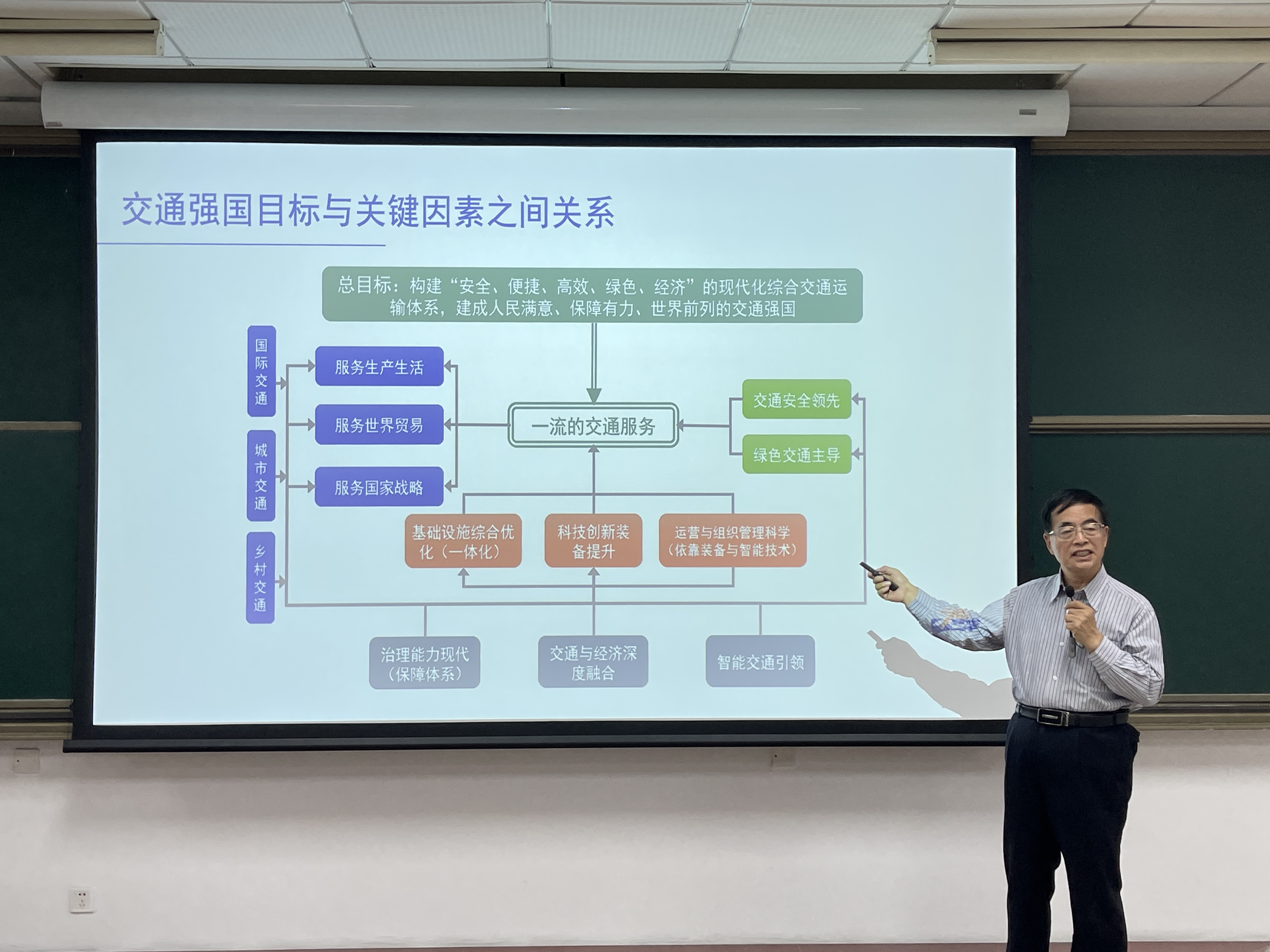 2023年10月16日晚,2023年秋季学期第二场“形势与政策大讲堂”在良乡校区综合教学楼A206顺利举办。本次活动特邀清华大学教授、博士生导师、交通研究所所长陆化普主讲,讲座由形势与政策教研室主任李璎珞主持。讲座以“建设交通强国:目标、关键和人才需求”为主题,采用线下讲授与线上延河课堂直播相结合的方式,共有12个班级、2000余名同学参与其中。